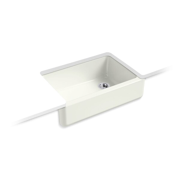 The Whitehaven apron-front kitchen sink features a streamlined and versatile farmhouse style to complement any decor. A large single basin accommodates large pots and pans, while the sloped bottom helps with draining and cleanup. Crafted from enameled cast iron, this sink resists chipping, cracking, or burning for years of beauty and reliable performance. A standard apron front makes it easy to install on 33-inch apron-front cabinetry. The Self-Trimming design requires only a simple rough cut, overlapping the cabinet face for beautiful results.