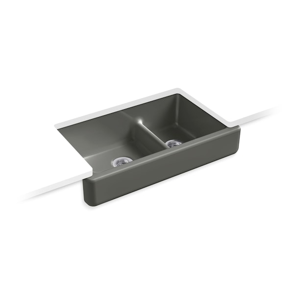 The Whitehaven apron-front kitchen sink features a streamlined and versatile farmhouse style to complement any decor. Perfect for remodeling projects, it has a shortened apron that allows for installation on most new or existing 36-inch standard cabinetry. The Self-Trimming design requires only a simple rough cut, overlapping the cabinet face for beautiful results and easy installation. A low barrier divides the two compartments, making it easy to wash and rinse large items while still keeping the two basins separate. Crafted from enameled cast iron, this sink resists chipping, cracking, or burning for years of beauty and reliable performance.