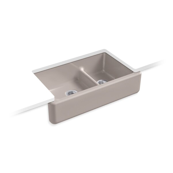 The Whitehaven apron-front kitchen sink features a streamlined and versatile farmhouse style to complement any decor. The Self-Trimming design requires only a simple rough cut, overlapping the cabinet face for beautiful results. The sink is designed to fit in most standard 36-inch apron-front cabinetry. A low barrier divides the two compartments, making it easy to wash and rinse large items while still keeping the two basins separate. Crafted from enameled cast iron, this sink resists chipping, cracking, or burning for years of beauty and reliable performance.