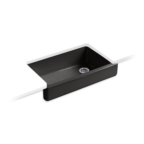 The Whitehaven apron-front kitchen sink features a streamlined and versatile farmhouse style to complement any decor. Perfect for remodeling projects, it has a shortened apron that allows for installation on most new or existing 36-inch standard cabinetry. The Self-Trimming design requires only a simple rough cut, overlapping the cabinet face for beautiful results and easy installation. A large single basin accommodates large pots and pans, while the sloped bottom helps with draining and cleanup. Crafted from enameled cast iron, this sink resists chipping, cracking, or burning for years of beauty and reliable performance.