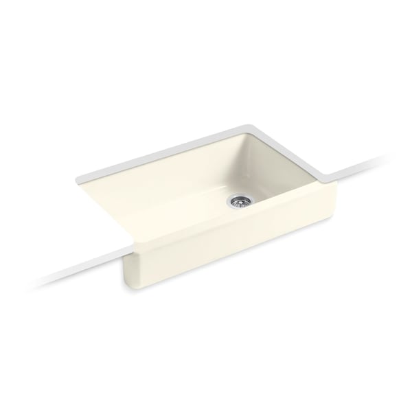 The Whitehaven apron-front kitchen sink features a streamlined and versatile farmhouse style to complement any decor. Perfect for remodeling projects, it has a shortened apron that allows for installation on most new or existing 36-inch standard cabinetry. The Self-Trimming design requires only a simple rough cut, overlapping the cabinet face for beautiful results and easy installation. A large single basin accommodates large pots and pans, while the sloped bottom helps with draining and cleanup. Crafted from enameled cast iron, this sink resists chipping, cracking, or burning for years of beauty and reliable performance.