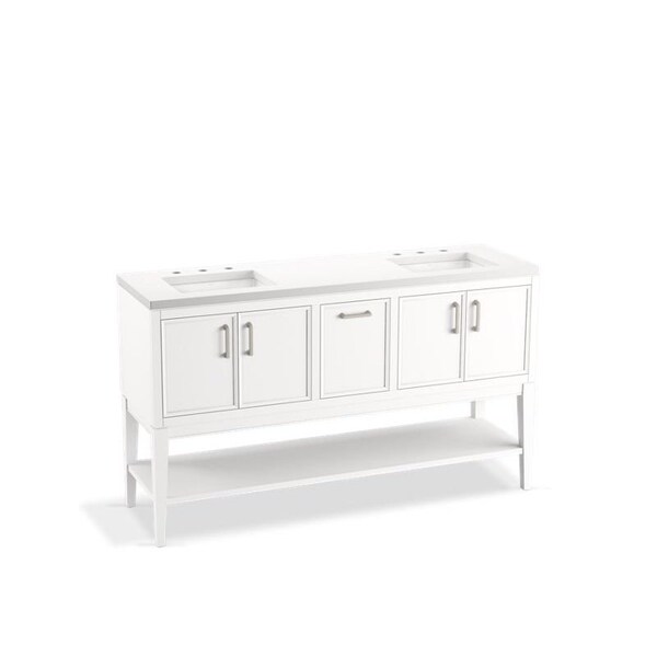 Timeless, simplistic pieces updated for the modern home, Winnow bathroom cabinets are at once familiar and different. Optional tall, tapered legs and symmetrical design are recognizably Shaker, while beveled door and drawer fronts and hardware with rounded corners deliver fresh details. The perfect balance of classic, elegant, and versatile, Winnow vanities come to life when you select your cabinet color. Cabinet, countertop, sinks, legs, shelf, and Vibrant Brushed Nickel hardware are included with the set, which is ready for self-assembly on legs. Additional hardware finishes are also available.