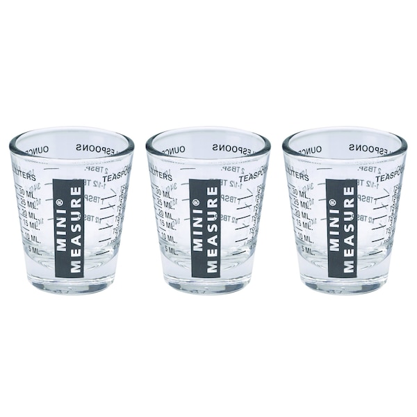 Mini Measure Set of 3 precisely measures dry and liquid ingredients for Boilermakers, balanced recipes, mixing delicious beverages, making craft cocktails, and more Made from heavyweight glass; allows clear view of contents for more control and accuracy; weighted base helps reduce tipping for less mess 20 measurements permanently marked on the glass; won't fade or wear off; increments up to 6-teaspoons, 2-tablespoons, 1-ounce, and 30-milliliters Easily measure and transport smaller amounts without them spilling; steadier than using measuring spoons; perfect for kitchen, home, lawn, and garden Set of 3 Mini Measures; sturdy, durable, compact for easy storage; hand wash in warm, soapy water; Proposition 65 compliant