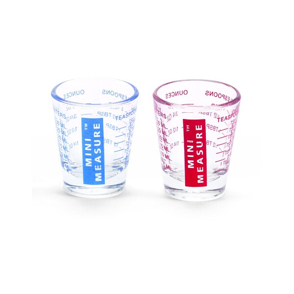 Mini Measure Set of 2 precisely measures dry and liquid ingredients for Boilermakers, balanced recipes, mixing delicious beverages, making craft cocktails, and more Made in America from heavyweight glass; allows clear view of contents for more control and accuracy; weighted base helps reduce tipping for less mess 20 measurements permanently marked on the glass; won't fade or wear off; increments up to 6-teaspoons, 2-tablespoons, 1-ounce, and 30-milliliters Easily measure and transport smaller amounts without them spilling; steadier than using measuring spoons; perfect for kitchen, home, lawn, and garden Set of 2 Mini Measures; sturdy, durable, compact for easy storage; dishwasher safe for easy cleanup; Proposition 65 compliant