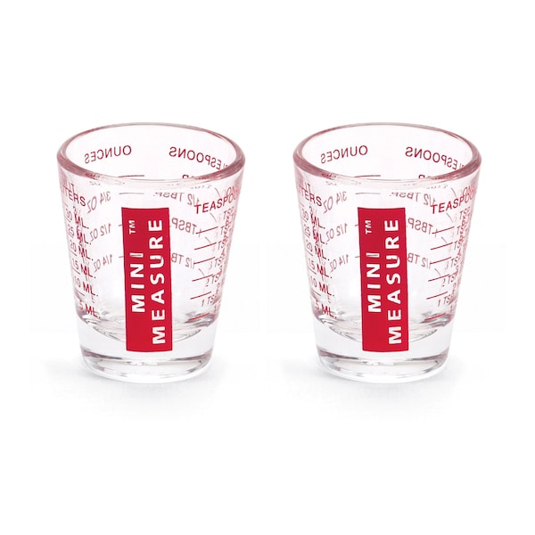 Mini Measure Set of 2 precisely measures dry and liquid ingredients for Boilermakers, balanced recipes, mixing delicious beverages, making craft cocktails, and more Made from heavyweight glass; allows clear view of contents for more control and accuracy; weighted base helps reduce tipping for less mess 20 measurements permanently marked on the glass; won't fade or wear off; increments up to 6-teaspoons, 2-tablespoons, 1-ounce, and 30-milliliters Easily measure and transport smaller amounts without them spilling; steadier than using measuring spoons; perfect for kitchen, home, lawn, and garden Set of 2 Mini Measures 1 black and 1 red; sturdy, durable, compact for easy storage; hand wash in warm, soapy water; Proposition 65 compliant