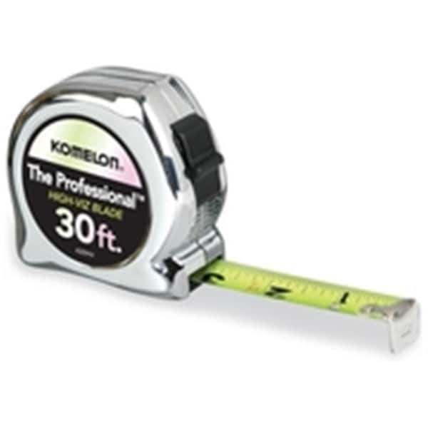 Features Compact chrome case. Nylon coated blade. Unique high viz neon colored paint Specification Blade Length - 30 ft. Blade Width - 1 in. Blade Thickness - 0.0051 in. Measuring System - English Graduations - Feet / Inches Width - 4.5 in. No. of Scales - 1 Stud Markings - Yes Blade Material - Steel Blade Finish - Nylon Color - Chrome Case Material - Chrome Plated ABS Plastic Finish - Chrome Depth - 2 in. Height - 6 0.75 in. Material - Steel Return Motion - Power Item Weight - 0.10 lbs.