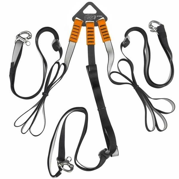 Lifting system for inflatable boats RIB made of a three-point lifting sling with rigging plate, additional bridle for fourth attachment point, and two 18'' diameter loop straps. Aluminum rigging plate spreads the load evenly and creates one attachment point for quick connecting. Adjustable up to 11'-6'' inside leg and 8'-6'' outside legs. Additional bridle with 27'' legs, 1-3/4'' ring, and stainless quick release snap shackles for creating the fourth attachment point. 18'' diameter straps used to connect to objects without attachment points. Safe working load for system is 500 pounds 227 Kg.