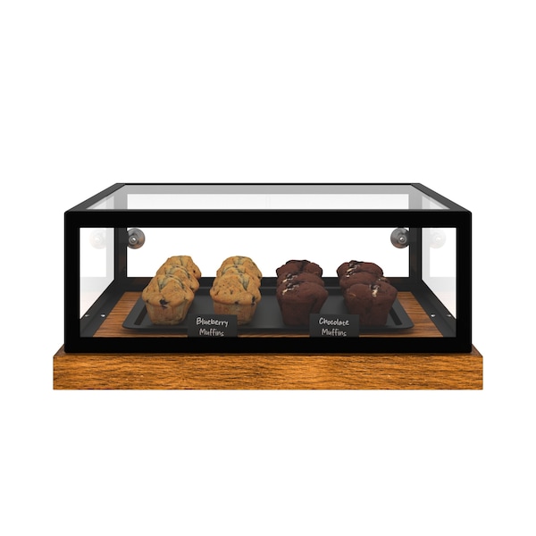 KoolMore 20in Wooden and Glass Muffin / Cake Display Case Showcase your baked goods with modern elegance. The KoolMore 20 Wooden and Glass Muffin / Cake Display Case combines a sleek black metal frame with crystal-clear tempered glass and a warm wood-grain base to create a countertop centerpiece that enhances every presentation. Designed for cafes, bakeries, delis, and home entertainers, this display case offers full product visibility while maintaining a clean, contemporary aesthetic. Smooth sliding doors make serving effortless, and the durable ash-wood base adds natural charm and support. Whether you're showcasing muffins, pastries, donuts, or small cakes, this compact yet spacious display case beautifully combines style and function. Key Features Modern Black-Frame Design - Sleek metal edging paired with clear glass panels creates a contemporary display that complements any decor. Warm Wood-Grain Base - Rich ash-wood interior and sturdy wooden platform add natural beauty and durability for everyday use. Crystal-Clear Visibility - Tempered-glass sides and top provide unobstructed, multi-angle viewing to help boost impulse sales. Smooth Sliding Doors - Rear sliding glass panels with chrome pull knobs allow easy access for serving while keeping contents protected. Compact Countertop Size - Space-efficient 20 x 15 footprint fits comfortably on bakery counters, cafe shelves, or display tables. Durable Commercial Construction - Iron frame, tempered glass, and real wood materials ensure long-lasting performance in busy environments. Perfect for Pastries & Small Cakes - Ideal height and interior layout for showcasing muffins, cookies, pastries, mini cakes, and more.