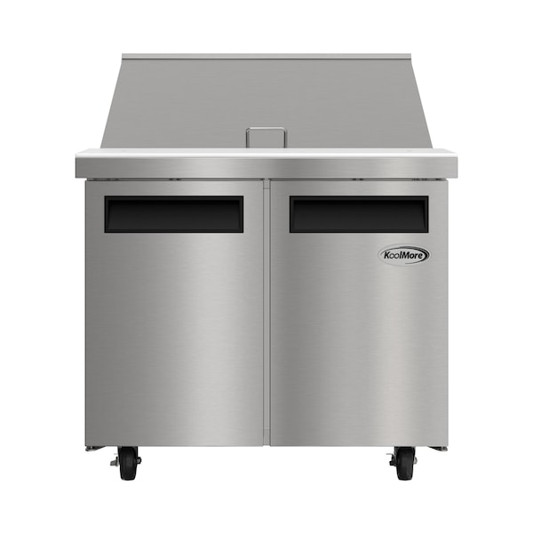 KoolMore 36-In. Mega top Salad and Sandwich Prep Table. Designed for demanding commercial kitchens, the KoolMore 36 Mega Top Salad and Sandwich Prep Table blends performance, capacity, and convenience. The spacious lower cabinet provides 11 cu. ft. of cold storage with adjustable shelves, each capable of supporting up to 88 lbs., making it perfect for ingredients or prepped items. The mega top compartment accommodates fifteen 1/6 GN pans, with plastic pans included-ideal for sandwiches, salads, and deli prep. A replaceable high-density polyethylene cutting board spans the width for efficient prep work. The robust refrigeration system keeps temperatures between 33°F and 40°F, featuring a digital control panel and bright LED display for easy monitoring. The insulated stainless-steel lid helps retain cold air, while automatic defrost and consistent airflow minimize maintenance. With a durable stainless-steel construction and four swivel casters (two locking), it is easy to clean and reposition. Key Features: Spacious 11 Cu. Ft. Cold Storage Compartment: The lower refrigerated section provides 11 cubic feet of space, featuring two adjustable polymer-coated steel shelf that can hold up to 88 lbs. This makes it ideal for storing backup ingredients or prepping essentials at food-safe temperatures. 15-Pan Mega Top Configuration with Included Plastic Pans: Engineered to maximize prep efficiency, the top compartment accommodates fifteen 1/6 GN pans-ideal for organizing sandwich toppings, salad components, or deli ingredients. Plastic pans are included for immediate use. Reliable Cooling Performance: This prep table uses a powerful refrigeration system to maintain a consistent temperature range of 33°F to 40°F, helping preserve the freshness and quality of your ingredients throughout the day. Digital Temperature Control with Bright LED Display: A user-friendly digital control panel located on the front allows staff to monitor and adjust temperatures easily. The high-visibility display ensures at-a-glance accuracy throughout the day. Replaceable High-Density Polyethylene Cutting Board: Includes a durable 36.14 x 8.07 x 0.39 cutting board made of food-safe, high-density polyethylene. The board is easy to remove and replace for cleaning or when swapping out for specific prep needs.