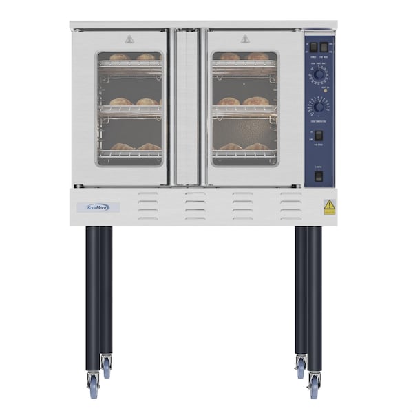 Cook Like a Pro Chef with a Liquid Propane Convection Oven When it comes to commercial kitchens the oven is often the most important appliance in the room. And if youre baking bread, pastries, pizza, or other delicious foods you want a convection oven that offers fast, consistent cooking and matches your baking style. We developed the KoolMore Single Deck Liquid Propane Convection Oven as a way to give you more control and versatility in the kitchen while ensuring you can continue to cook your way to a successful day. Great for small restaurants, bakeries, and commercial kitchens this is a must-have unit for making food everyone will love. With Superior Cooking Performance, this liquid propane convection oven is a 54,000 BTU unit with adjustable temperatures ranging from 150 DegF to 500 DegF, so you can bake bread, cookies, pizza, and more while getting the right balance of softness, crispiness, and delicious textures. All while using liquid propane and a 120V electrical connection for seamless kitchen versatility. Our convection oven unit features built-in lighting that can be turned on or off, which helps you keep a watchful eye on food as it's cooking or baking. Product Details: Commercial Convection Oven Liquid Propane Lockable Rolling Caster Wheels Single Deck Temp Range: 150 DegF to 500 DegF Total BTU: 54000 Plug Type: 120V Dual Independent Glass Doors Hi/Low Fan Speed Button