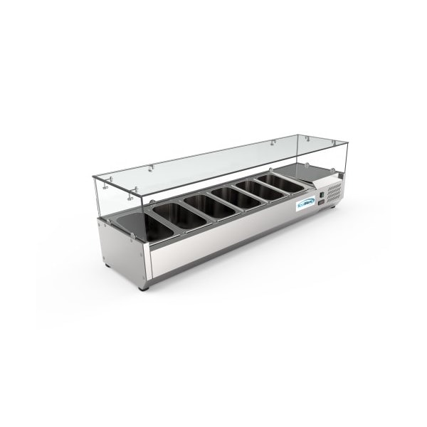 This 40” 3 pan countertop prep rail is a perfect solution for establishments with limited space, keep key ingredients within reach and ensure that they are always kept at optimal temperature. Built with smooth, durable, and corrosion resistant stainless steel that will stand up to the high volume commercial kitchen environment, retain an attractive finish, and is easy to clean. Includes three removable stainless steel 1/3 food pans that have a capacity of 6.1 qt. each. This unit can also accommodate 6 smaller 1/6 food pans. Fill the pans with salad toppings or pizza and sandwich ingredients; each pan is 12 5/8 "L x 6.78” W" x 6”H. The front digital temperature display makes the temperature easy to monitor and control. The stainless steel lid provides easy access and ensures that food remains fresh when not in use. A glass sneeze guard (sold separately) can also be attached to turn this unit into a self-serve buffet station. Overall Dimensions: 39.3”L x 15.5”W 11.5”H net Weight, 81.5. Lbs. temperature range: 32 - 40, 60 hertz, 115 V, 1.6 amps, environmentally friendly R600a refrigerant. It’s time to make your kitchen more it’s time for KoolMore