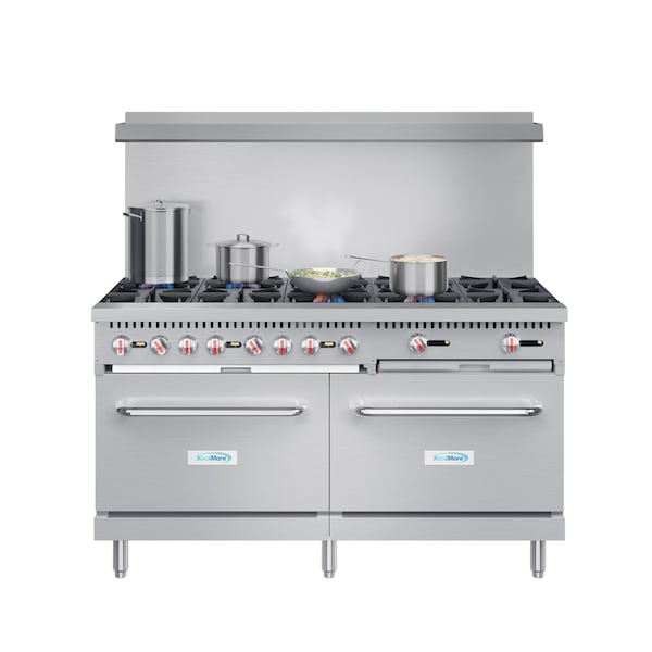 Crafting Unforgettable Meals Begins with an LP Range that Can Do It All! When it comes to commercial kitchen success it often comes down to the tools and appliances youre working with; especially when it comes to your range. Thats why we created the KoolMore LP Gas Range and fitted it with all the extras needed to prep meals and recipes with exceptional precision. From our dual ovens to our ten open-top burners it features all the amenities youll need to do it with clean precision and exceptional style. Large Shelf and Backsplash, This big 60-inch also boasts a wide/tall backsplash to help keep your space cleaner and a shelf built-in above, so you can keep extra pots, pans, and supplies within easy reach. Support your busy kitchen, while super easy to manage with a single chef the larger size of our all-in-one unit means multiple cooks can support each other when theyre making different meals or working to stay on top of different aspects of an entire recipe. Optional Caster Wheels, We Now offer a compatible set of rolling caster wheels KM-CR-CASTERS for our unit to make it easier to slide away from the wall or move when its time for deep cleaning, so you dont have to lift it. Features: Commercial Liquid Propane Gas Range Large 60 in. Range High-Performance 10 Open-Top Burners Easy-to-Clean Unit Stainless-Steel Craftsmanship