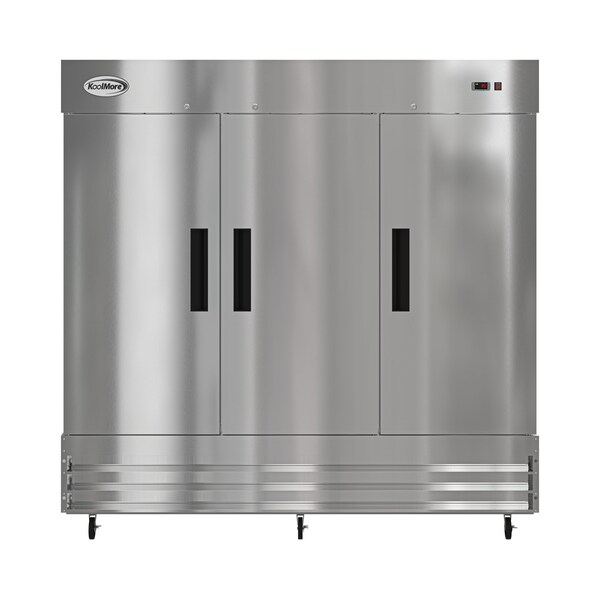Your commercial kitchen deserves a cool, sleek, convenient refrigerator solution. The KoolMore triple door Reach-In Commercial Refrigerator is made of gleaming stainless steel and aluminum. A 3-door NSF Commercial Refrigerator to store inventory and keep products icy fresh. Ideal for restaurants, cafes, hotels, and all types of commercial kitchens. A bottom-mounted compressor and raised bottom shelf for convenient loading, unloading, and maintenance. Recessed handles for easy access. The self-closing feature ensures food stays fresh and frozen. 9 deep adjustable shelves coated in epoxy for maximum corrosion resistance. This Upright Commercial refrigerator holds up to 72 cu. ft. external digital temperature control and display to easily monitor + control temperature. 6 casters make it highly portable for kitchen convenience. Highly certified: ETL Listed for Safety and Sanitation, making it NSF ANSI 7 Standard for Commercial refrigerators. Its time to make your kitchen more. Its time for KoolMore. Features: 430 Stainless steel exterior Eco-friendly R290 refrigerant 6 Casters - 3 locking 2 Door locks for security and freshness 9 adjustable shelves Self-closing door with stay-open feature ETL Listed for Safety and Sanitation Bottom mounted compressor 115V electrical connection NEMA 5-20P plug 1