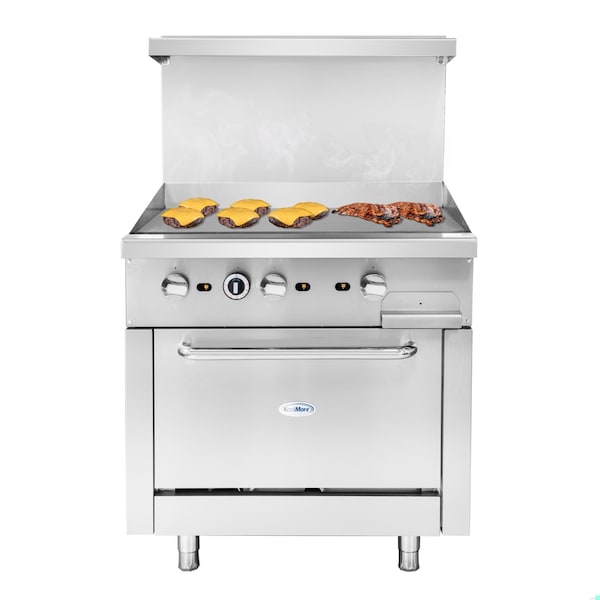 KoolMore Commercial Range with a 36 In. Oven and 36 In. Griddle Top Introducing our Commercial 36 Oven with a versatile 36 Griddle Top, engineered to meet the high demands of professional kitchens. Running on natural gas, this powerhouse combines a spacious 4.59 cubic foot oven with a full-size griddle, delivering a total of 90,000 BTU for unparalleled cooking performance. The oven's ceramic-coated interior ensures easy cleaning and excellent heat retention, while the adjustable shelving provides flexibility for various cooking needs. The griddle, made from carbon steel, offers exceptional heat distribution, ideal for achieving that perfect sear. With a quick preheat time to 400 DegF in just 10 minutes, this appliance enhances kitchen efficiency. Its manual controls, durable stainless-steel construction, and practical features like a drip pan, high backsplash, and side splash ensure both safety and convenience. The large upper shelf provides additional storage, making this CSA-listed oven and griddle combo an indispensable asset for any culinary professional. Key Features: Full Griddle Top: The expansive 36 In. griddle top provides ample cooking space, perfect for preparing a variety of dishes simultaneously, from breakfast items to grilled favorites. Natural Gas Operation : Designed to run on natural gas, providing a reliable and energy-efficient heat source for all your cooking needs. Ceramic-Coated Interior: The oven's ceramic-coated interior offers superior heat retention and easy cleaning, ensuring consistent cooking results with every use. Spacious Oven Capacity: With an interior size of 25.79 x 22.44 x 13.78, the oven boasts 4.59 cubic feet of space, accommodating large trays and multiple dishes with ease. Adjustable Shelving: Features two oven racks with three adjustable positions, allowing for flexible arrangement of different-sized pans and dishes. Efficient Preheat Time: The oven quickly reaches a temperature of 400 DegF in just 10 minutes, reducing wait times and enhancing kitchen productivity. Powerful Heating: Equipped with three 30,000 BTU griddle burners and a 33,000 BTU oven burner, this unit ensures high, consistent heat for all your cooking needs.