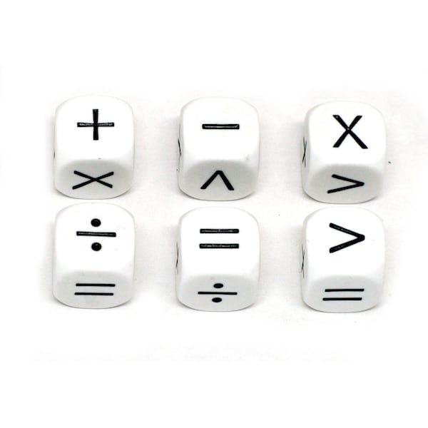 Koplow Games Math Operators Dice Set is a fun, hands-on way for students to learn basic math operation. Children learn more effectively when it is reinforced through play. Perfect for individual play, in small groups or as a classroom making these dice a great educational resource. Dice measure 16mm (5/8"). Each set includes 6 white opaque operator dice and feature symbols for addition, subtraction, multiplication, division, greater than/less than and equal to ( + , - , x , ÷ , > , < , = ). Sold as 6 sets, 36 dice total.