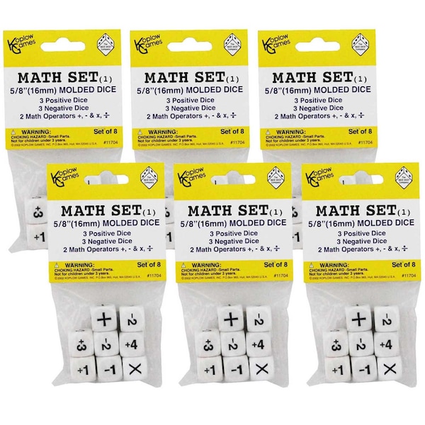 Koplow Games Math Dice Set is a fun, hands-on way for students to learn basic math skills. Children learn more effectively when it is reinforced through play. Perfect for individual play, in small groups or as a classroom making these dice a great educational resource. Dice measure 16mm 5/8. Each set includes 8 dice: 3 positive dice, 3 negative dice and 2 math operator dice. Sold as 6 sets for a total of 48 dice.