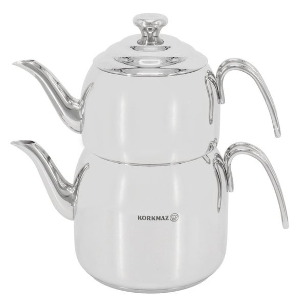 With this gorgeous traditional Turkish stainless steel Korkmaz Tea Pot set, you can enjoy delicious authentic teas whenever you want. The Solar Base system offers superior heat distribution to use less time and energy to heat up. The double stacking tea pots with vintage lid design is sure to look elegant on your kitchen and the mirror polish is sleek. The tea pots can be used stacked on top of each other to prepare tea in the traditional Turkish way, or they can be used separately as each pot comes with its own lid.