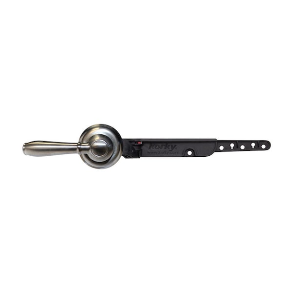 Designed to fit the majority of toilets, the Korky StrongARM Handle and Lever easily adjusts to fit all tank positions including: front, side, angle, right and down. Optimized for use with both standard 2 inch and large 3 inch flappers and canister-style flush valves, the engineer grade material in common stress areas performs as well as brass and aluminum levers. The StrongARM lever is adjustable to eliminate the need to bend for fitment and fits most popular brands, including American Standard, Kohler, TOTO and others. The faucet style handle, in a brushed nickel finish, is a great way to upgrade any toilet and compliment the bathrooms decor.