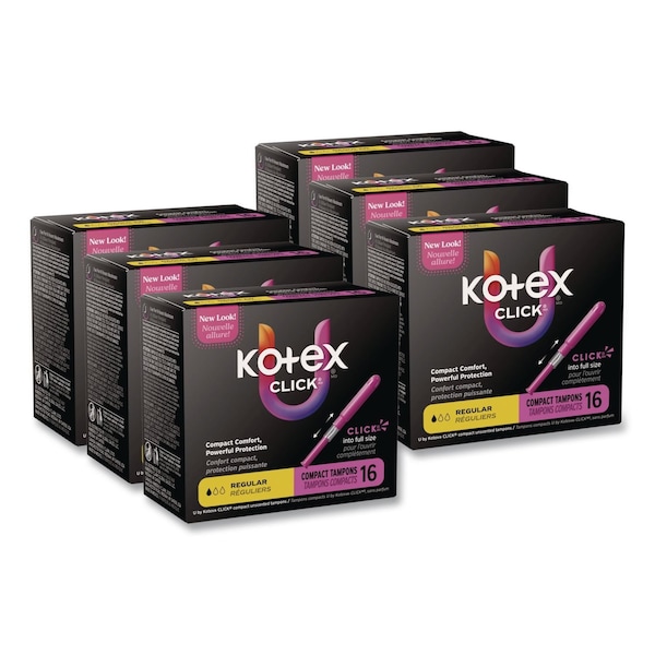 Get full-sized period protection with a comfortable compact tampon! U by Kotex Click Tampons allow you to discreetly carry in your purse or pocket. Small in size but big on protection, these tampons go from compact to a full-size tampon in one easy step. Pull the lower half of the tampon until you hear it lock and then insert. Click Tampons are designed with a smooth tip for comfortable, quick and easy insertion. The tampon expands so you're fully covered to help stop leaks. These unscented tampons are not made with natural rubber latex and have no fragrance added.