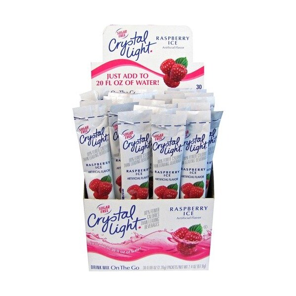 Crystal Light On-The-Go Mix Sticks offer a low-calorie beverage alternative. Simply pour the raspberry-flavored contents of the stick into a 20 oz. bottle of water or a glass with 2-1/2 cups of water for a refreshing treat. Sticks are a simple way to enjoy hydration on the go. Crystal light drink has 5 calories per serving.