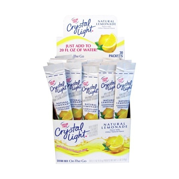 Crystal Light On-The-Go Mix Sticks offer a low-calorie beverage alternative. Simply pour the lemonade-flavored contents of the stick into a 20 oz. bottle of water or a glass with 2-1/2 cups of water for a refreshing treat. Sticks are a simple way to enjoy hydration on the go. Crystal light drink has 5 calories per serving.