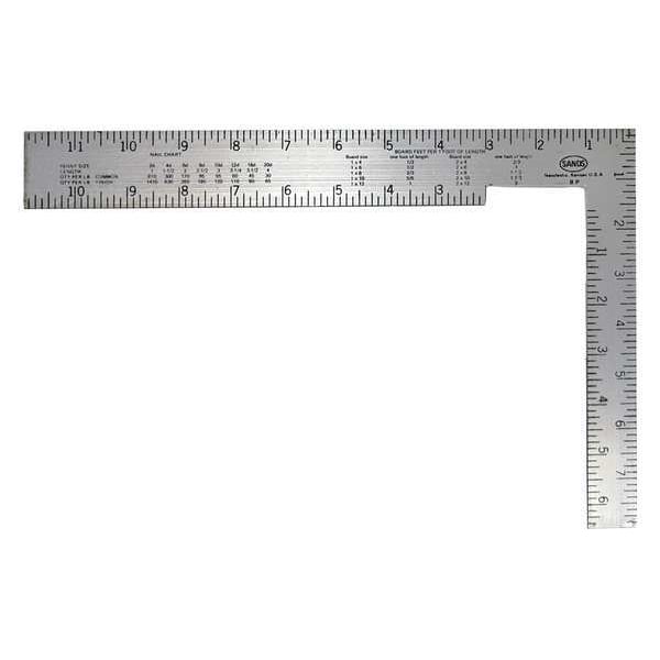 Soffit Square, Base Length 8 in, Base Width 1 in, Blade Length 12 in, Blade Width 1 1/2 in, Blade Material Steel, Graduation Mark Style Etched, Graduation Marks - Base 1/8 in, Graduation Marks - Blade 1/8 in, Specialized Scales Reverse Reading, Base Material Steel, System of Measurement SAE, Square Type Soffit Square, Coating Anti-Rust, Edge Style Square, Finish Polished, Graduation Color Black, Thickness 0.06 in, Numeric Marks Inches, Square Color Gray
