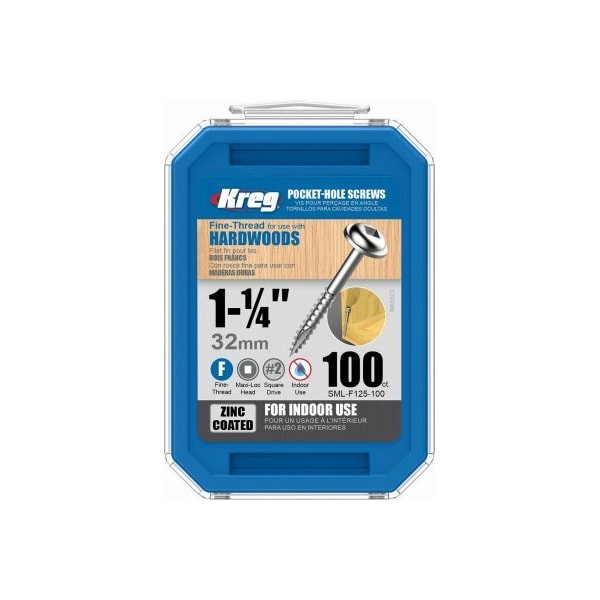 100 Pack, 125, Fine, Square, MaxiLoc Head Fine Pocket Hole Screws, Primarily For Use In Pocket Hole Joinery, Fine Threaded For Use In Hardwoods, Made Of Case Hardened Steel With A Zinc Coating, MaxiLoc Washer Head To Sit Flush In The Pocket Hole, Smooth Shank To Help Draw Pocket Hole Together, SelfTapping Auger Tip