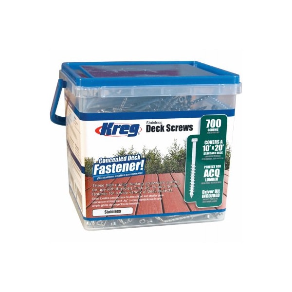 700 count 8 x 2 KTX square drive pan head stainlesssteel deck screws Premiumquality screws designed for use with the Kreg deck jig Stainless steel construction for ultimate corrosion protection Selftapping tip for easy driving Smooth upper shank to draw deck board tightly against the joist Compact head with flat underside to prevent wood splitting Casehardened steel for high strength without bending or snapping The 2 in length for use with 44 and 54 deck boards