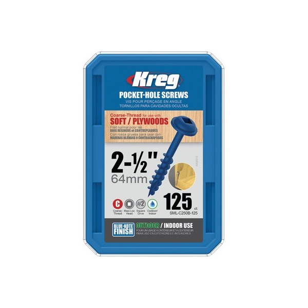 Kreg, 125 Pack, 8, BlueKote Pocket Hole Screws, Feature 3 Anti Corrosion Layers, Provide Rust Resistance Up To 400 Percent Greater Than Zinc Plated Screws Work With Pressure Treated Material, 8 All Small Coarse Threaded Screws With The Exception Of Stainless