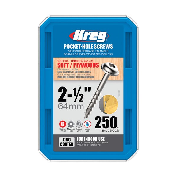 Kreg zinc screws are a good choice for a wide variety of indoor projects with limited exposure to the elements. Zinc screws provide adequate rust protection and serve as an affordable alternative to the more protective Blue-Kote and stainless screw varieties.