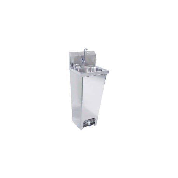 - KROWNE PEDESTAL HAND SINK 16" X 15" X 42" OA WALL MOUNT W/BRACKET 14" X 10" FRONT-TO-BACK X 5-5/8" DEEP SPLASH MOUNT GOOSENECK SPOUT FAUCET OPERATED W/FOOT PEDAL 1-1/2" DRAIN SOAP DISPENSER STAINLESS STEEL CONSTRUCTION FOOT PEDESTAL STANDING HAND SINK