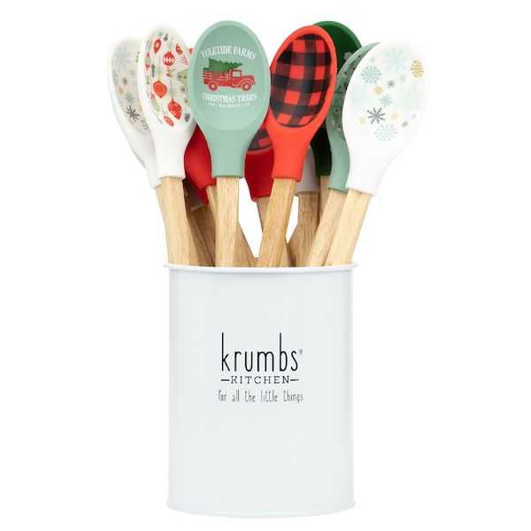 Add a little farmhouse charm to your holiday with our sweetly festive mixing spoons. Complete with a white tin display, these farmhouse-inspired wares are designed with easy-clean, heat-resistant silicone and a removable wooden handle.