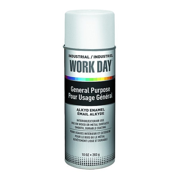 Spray Paint, Opacity 100 Percent, Maximum Dry Film Thickness Not Applicable, Maximum Wet Film Thickness Not Applicable, Coating Application General Purpose, Color Family White, Compatible Surface Material Metal, Wood, Sheen Gloss, Finish Texture No Texture, Resin Type VT Alkyd, Color White, Container Size 10 oz, Coverage Area 9 to 13 sq ft, Base Type Solvent, Dry Time 15 min, Use Location Exterior, Interior, Sub Brand Work Day, Container Type Can, Dry Time Tack Free 15 min