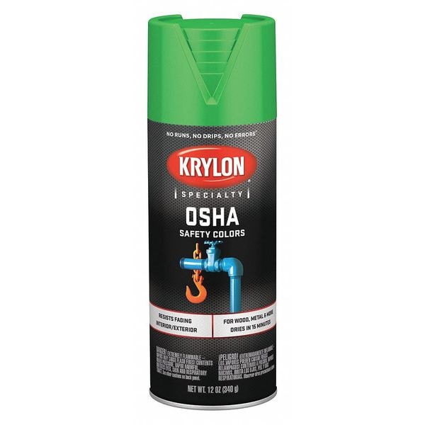 Spray Paint, Opacity 100 Percent, Coating Application General Purpose Spray Paint, Color Family Green, Compatible Surface Material Metal, Wood, Sheen Gloss, Finish Texture Smooth, Resin Type Acrylic Enamel, Color Safety Green, Container Size 16 oz, Coverage Area 18 sq ft, Base Type Solvent, Dry Time 15 min, Use Location Exterior, Interior, Sub Brand OSHA, Container Type Aerosol Can, Dry Time Tack Free 1 hr, Dry Time to Recoat 4 to 24 hr, Maximum Application Temperature 85 Degrees F