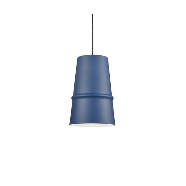 Single Lamp Pendant With Conical Aluminum Shade Showcasing Powder-Coated Finishes Against A Matte White Interior. Exterior Shade Colors Are Black, Gray, White Or Blue. Metallic Exterior Options Are Brushed Nickel Or Gold. Suspended By Cloth Cable To A Max