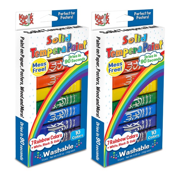 Tired of the endless mess of painting? Fear not! Kwik Stix Solid Tempera Paint sticks take the mess out of painting while keeping all the fun! Simply uncap, twist, and paint! Kwik Stix have a fast drying formula that allow them to dry in 90 seconds while still leaving a paint-like finish! No cups, smocks, water or brushes required. Kwik Stix come in assorted vibrant colors with coverage that won't crack. Great on poster paper, cardboard, wood and canvas - and MORE! Nut, Egg, and Gluten free! Washable and Non Toxic. Each pack includes 10 Kwik Stix in Rainbow Colors. Sold as 2 packs for a total of 20 Kwik Stix.