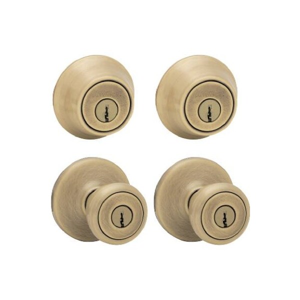 Kwikset Security, KA2, Antique Brass Finish, Tylo Combo Lockset, Consists Of 2 Tylo Entry Locksets Keyed Alike With Two 660 Single Cylinder Deadbolts, Adjustable Latches Fit Both 238 234 Backsets, Round Corner Strikes, ANSIBHMA A1562 Grade 3 Security, KwikInstall Installation, Keyed In Pairs Of 2, Clear Pack