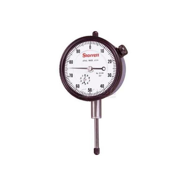 - 25-441j starrett dial indicators have a shockless, hardened steel gear train and are furnished with jewel bearings and lug-on-center backs. Conforms to agd specifications. features: rugged and simple unit construction with a "universally fitting" design one gear unit assembly non-reflecting white eggshell finish on dial unbreakable crystal massive bridge for rigid bearing support hardened stainless steel bottom stems can be held in fixtures without cramping rack action light but sturdy, no-glare satin finish on case direct acting compression spring eliminates side friction easy readability with the best, balanced style of graduation and number combination balanced and tapered hands are easy to follow replaceable low friction jewel bearings all gear trains are fully jeweled for sensitivity, smoothness and life sharp bezel serrations for positive grip interchangeable contact point positive-acting clamp locks bezel in position .375" mounting diameter (all agd models) four screw holes for 90 rotation of back special non-shock mechanism (can be furnished on most styles) is ideal for when an indicator may be subjected to repeated and excessive shocks