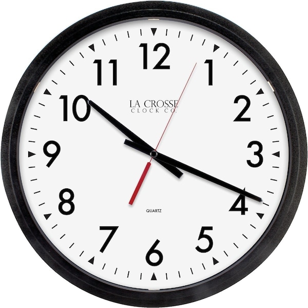 Quartz movement. Shatter-resistant plastic lens with metal hands. 12 dial diameter. 14 round x 2.5 D. case. Black. Requires 1 AA alkaline battery (not included).