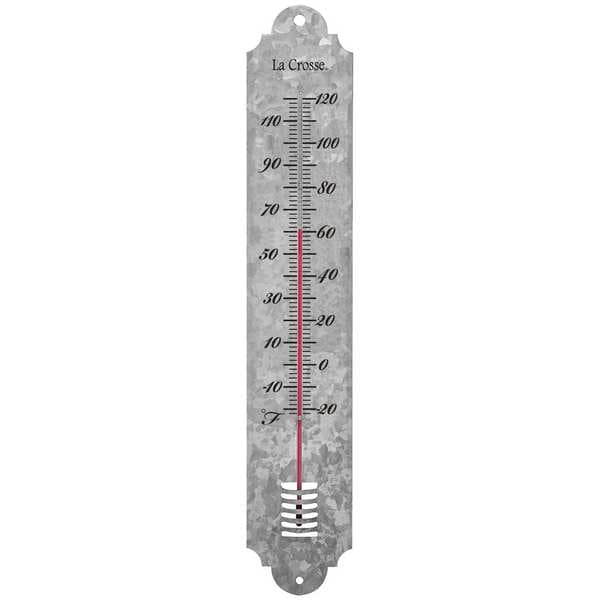 Thermometer, -20 Degrees to 120 Degrees F, Primary Scale Temperature, Case Material Galvanized Metal, Wall, 19 1/2 L x 3 1/2 in W