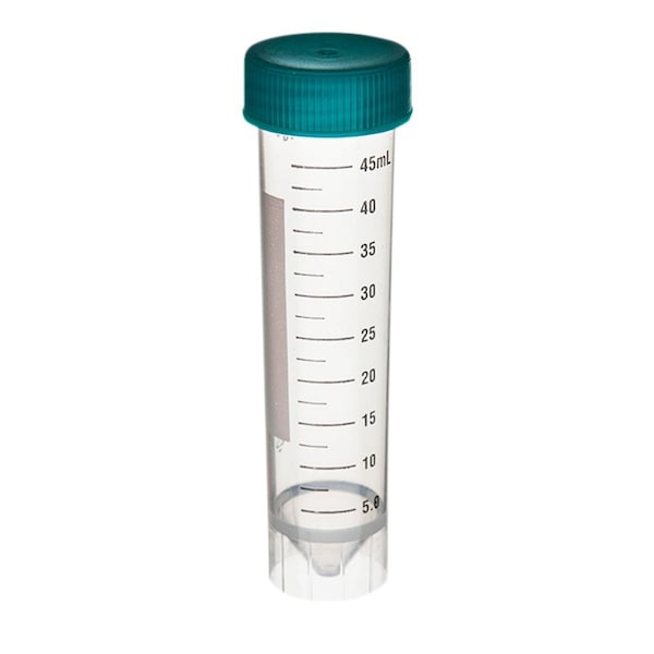 Self-standing tubes are ideal for reducing hybridization volumes. Polypropylene tubes allow full visibility of contents and feature graduated markings up to 50 ml. Tubes include large white solvent resistant labeling areas and black easy to read graduations that won't rub off. Graduations are tested for accuracy during every production lot. Supplied with easy to label flat cap.