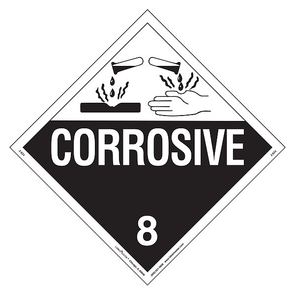 Corrosive Placard, Language English, Container Label/Placard Type Hazardous Class, Hazard Class Class 8 (Corrosive), DOT/UN Product Form Placard, Message Corrosive, Label Width 10 3/4 in, Label Height 10 3/4 in, Material Vinyl, Package Quantity 25