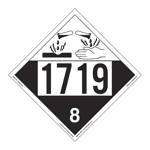 Corrosive Placard, Hazard Class Class 8 (Corrosive), DOT/UN Product Form Placard, Message Corrosive UN 1719, Label Width 10 3/4 in, Label Height 10 3/4 in, Material Removable Vinyl, Package Quantity 25