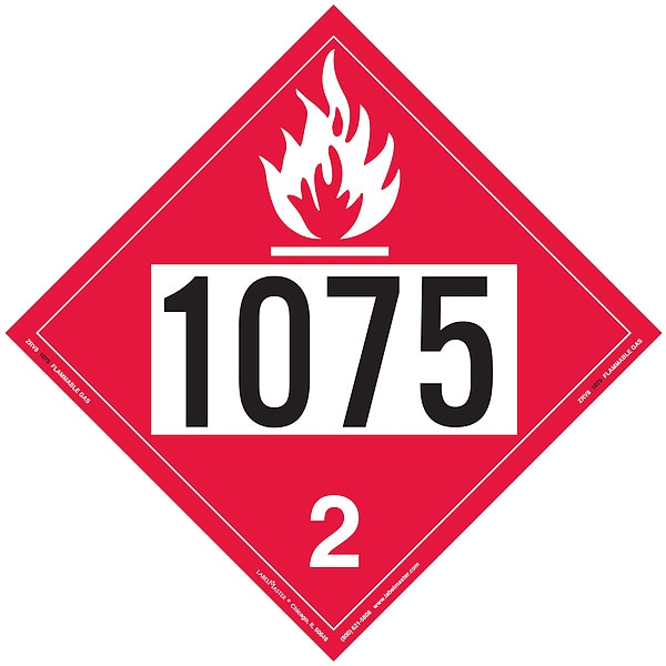 Flammable Gas Placard, Container Label/Placard Type UN, Hazard Class Class 2 (Gases), DOT/UN Product Form Placard, Message 1075, Label Width 10 3/4 in, Label Height 10 3/4 in, Material Vinyl, Package Quantity 25