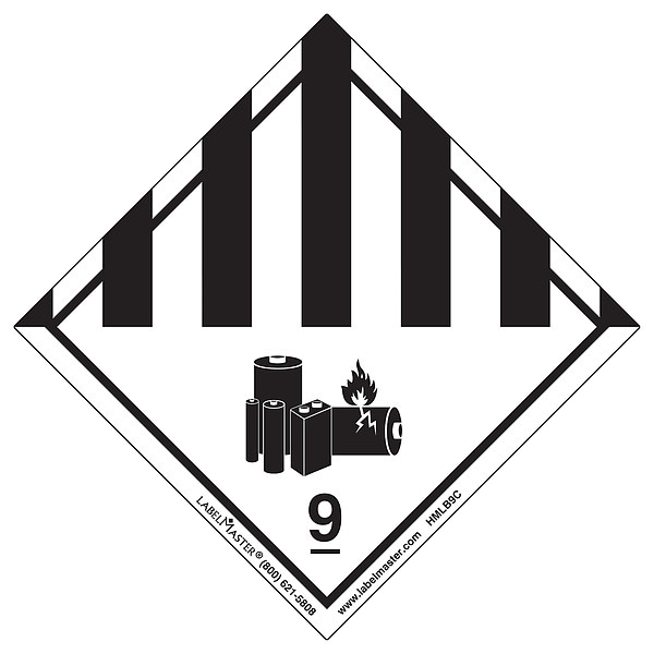 Hazard Class 9 Lithium Battery Label,Package Quantity 100, Adhesive, Hazard Class Class 9 (Misc), DOT/UN Product Form Label, Message Miscellaneous Dangerous Goods Lithium Battery, Label Width 3 15/16 in, Label Height 3 15/16 in, Material Paper, Package Quantity 100