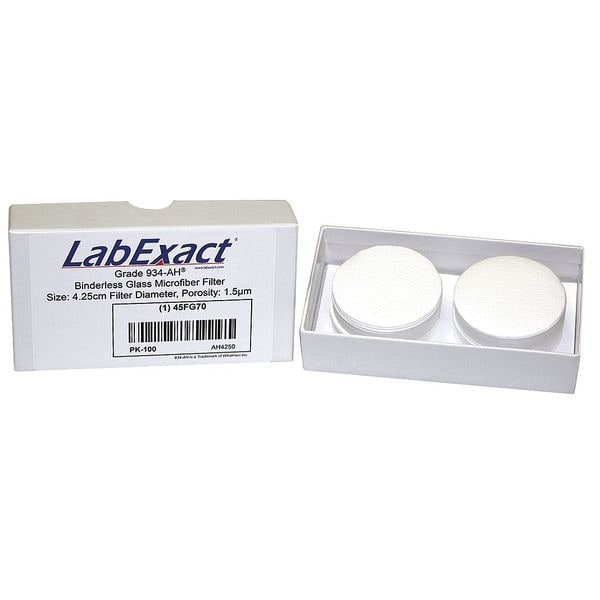 Glass Microfiber Filter, Diameter 4.25 cm, Grade 934-AH, Thickness 0.43 mm, Pore Size 1.5 um, Material Binderless Borosilicate Glass Microfiber, Product Type Filter, Maximum Operating Temperature - Centigrade 550 Degrees C, For Use With Air Pollution Monitoring, Cell Harvesting, Laboratory Applications, Liquid Scintillation Counting, Removal of Turbidity and Filtration of Bacterial Cultures, Total Suspended Solids in Water, Volatile Suspended Solids, Water Pollution Monitoring