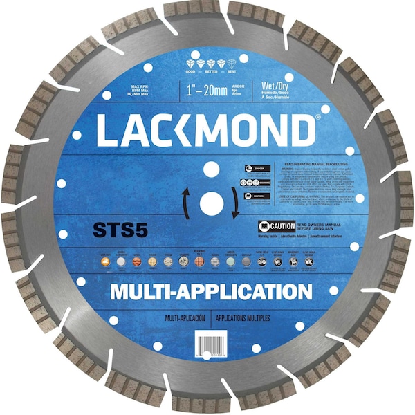 The STS-5 Multi-Application Blade is designed with a castellated segmented turbo rim with undercut protection and is ideal for cutting concrete, asphalt, green concrete, overlay, masonry, brick, block, stone, and much more. It is engineered with an air-cooling core to reduce heat and a high tension-core for durability.