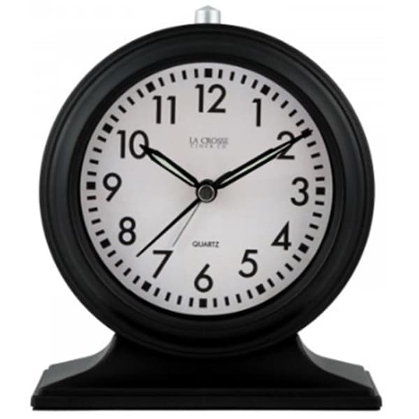Get the reliability you need without sacrificing style. The Analog Quartz Mantel Alarm Clock from La Crosse Clock Co. is a traditional beeping alarm clock. It has the added bonus of luminous hands for easy nighttime viewing. The classic design features a black matted frame, with black metal hands and quiet sweeping hands movement. Clock offers a soft base pad protects your surfaces from scratching. Does not include, but requires one AA alkaline battery for clock operation.