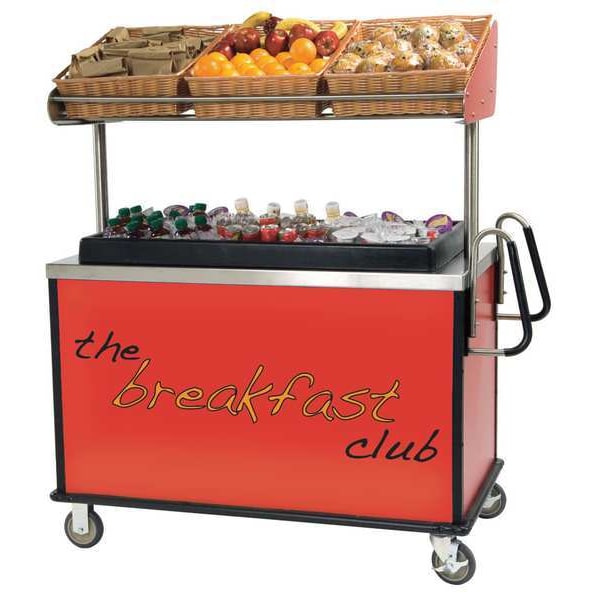 Breakfast Cart, Product Type Breakfast Cart, Material Stainless Steel, Color Red, Overall Height 67 in, Overall Depth 54 3/4 in, Overall Width 28 1/2 in, Caster Type (2) Fixed, (2) Swivel with Brakes, Caster Diameter 5 in, Caster Material Cushion Tread, Includes Bumper, Ergonomic Vertical Push Handle, Ice Bin, Number of Compartments 1, Standards Carbonfree(R) Certified