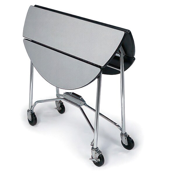 Room Service Table Cart, Shape Round, Overall Height 30 in, Overall Length Not Applicable, Overall Width Not Applicable, Diameter 40 in, Surface Material Laminate, Tabletop Color Gray Sand, Table Material Wood, Top Thickness 1 in, Weight Capacity 100 lb, Leaves Down Length 40 in, Leaves Down Width 22 1/4 in, Frame Color Silver, Caster Dia. 4 in, Caster Type Swivel, Frame Material Stainless Steel, Assembly Assembly Required
